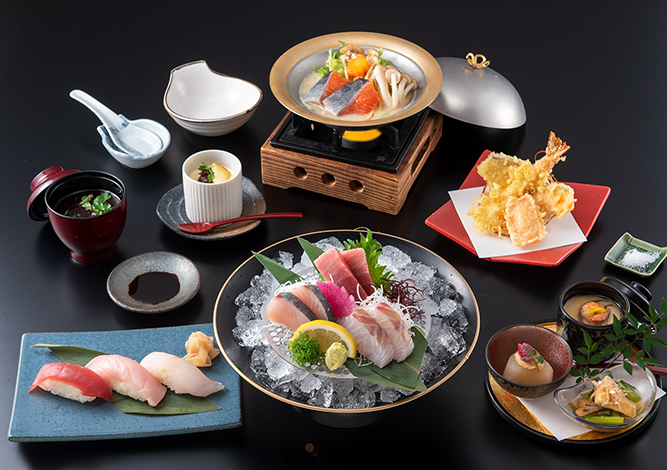 季節の小鉢五種・季節のお鍋・天然海老と季節野菜の天ぷら・旬のにぎり寿司四貫・お吸い物・季節のデザート